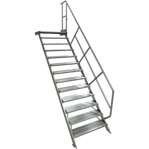 Escalier avec plate-forme à inclinaison à 1 main courante. Structure profils aluminium et pièces de jonction en acier traité. Plateforme haute avec garde-corps 1 côté, sous-lisses et plinthes. Marches fixées aux montants par visserie, montées sur cadre, anti-rotation. Marches en profilé d'aluminium strié antidérapant non corrosif, durable. Fixation de l'escalier par des équerres sur chacune des extrémités. Produit fabriqué en France.