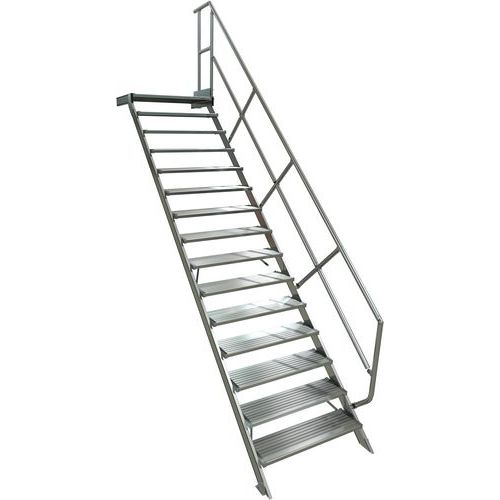Escalier avec plate-forme à inclinaison à 1 main courante. Structure profils aluminium et pièces de jonction en acier traité. Plateforme haute avec garde-corps 1 côté, sous-lisses et plinthes. Marches fixées aux montants par visserie, montées sur cadre, anti-rotation. Marches en profilé d'aluminium strié antidérapant non corrosif, durable. Fixation de l'escalier par des équerres sur chacune des extrémités. Produit fabriqué en France.