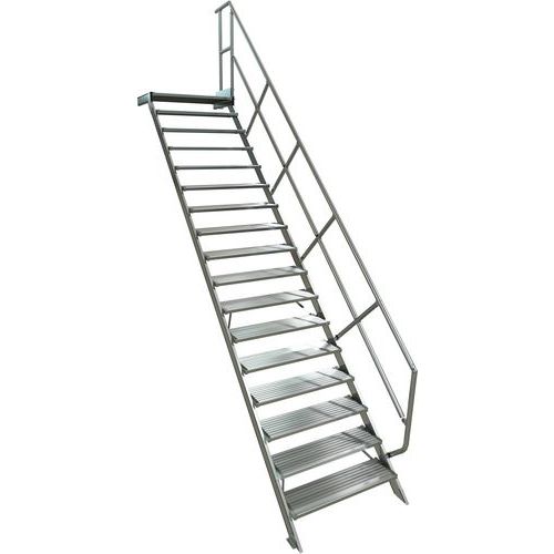 Escalier avec plate-forme à inclinaison à 1 main courante. Structure profils aluminium et pièces de jonction en acier traité. Plateforme haute avec garde-corps 1 côté, sous-lisses et plinthes. Marches fixées aux montants par visserie, montées sur cadre, anti-rotation. Marches en profilé d'aluminium strié antidérapant non corrosif, durable. Fixation de l'escalier par des équerres sur chacune des extrémités. Produit fabriqué en France.