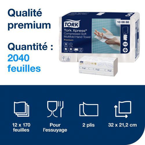 Tork Xpress® Essuie-mains interfoliés doux comprimés blancs H2. Gagnez du temps lors du rechargement et doublez la capacité des distributeurs grâce à des essuie-mains en papier comprimés à 50 %. Doux et absorbants, ils offrent une expérience haut de gamme aux clients. La distribution feuille à feuille améliore l'hygiène et réduit les déchets, puisque les clients ne touchent que l'essuie-mains qu'ils prennent. Nos distributeurs compacts et pratiques s'adaptent aux espaces exigus. Paquets comprimés : capacité augmentée de 100 % et manipulation plus facile. Deux fois plus de clients servis entre les rechargements. Gagnez de l'espace de stockage grâce à des paquets comprimés à 50 %.