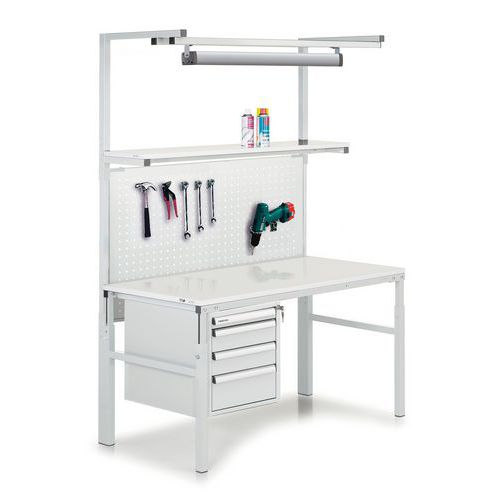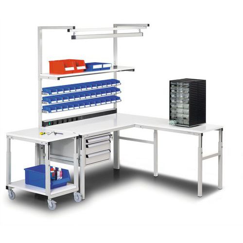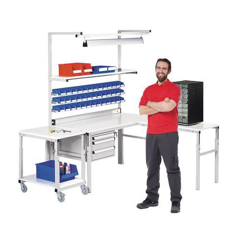 | Intitulé du produit | Établi antistatique TPH, Charge maxi: 300 kg, Largeur: 120 cm, Profondeur: 70 cm, Coloris: Gris Blanc |