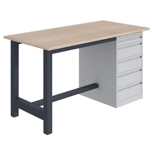 Plateau hêtre multiplis , épaisseur 40 mm. Caisson monobloc tôle acier épaisseur 9/10ème pliéenervurée. Equipé 5 tiroirs monobloc en tôle d'acier et soudés par points. Plateau constitué de plusieurs plis croisés de hêtre assemblés par collage sous haute pression. Dessus et chants poncés, arrêtes chanfreinées. Dessus et chants poncés, arrêtes chanfreinées. Châssis hauteur 800 mm sous plateau constitué de 2 pieds échelle en tube acier carré de 60 mm épaisseur 20/10ème pliée. 2 entretoises en tôle 25/10ème pliée en U 60 x 40 dont 1 servant de repose-pieds. Pied est équipé d'un embout plastique (jeu de 4 pieds réglables en option). Plage de réglage : 20 mm. Caisson réalisé en tôle d'acier épaisseur 9/10e pliée-nervurée. Equipé 5 tiroirs monobloc en tôle d'acier, soudés par points. Tiroirs sur glissière télescopique à billes à extension totale. L/H/P utiles tiroir : 37 x 7 x 55 cm. Charge admissible 50 kg. Serrure à clé centralisée. L/H/P caisson : 46 x 80 x 60 mm) Coloris caisson gris Ral 7035.