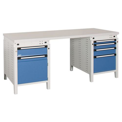 Établi extra large pour équiper l’atelier. Muni d’encoches pour le passage du matériel d’alimentation électrique et d’alimentation en air comprimé. Avec trous sur le côté pour suspendre des accessoires. Rangez vos affaires en sécurité dans les tiroirs à verrouillage central. Avec caissons pour votre matériel de plus grande taille. Fabriqué en France Garantie client : 3 ans Charge maxi (kg) : 1400