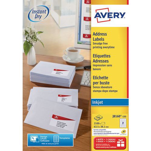 Étiquette adresse blanche Avery- Impression jet d'encre, Nb d'étiquettes/planche: 21, Nb d'étiquettes: 2100 Étiquette adresse blanche Avery- Impression jet d'encre, Nb d'étiquettes/planche: 21, Nb d'étiquettes: 2100
