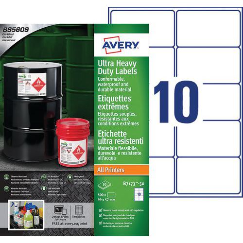 Étiquette souple à fort pouvoir adhésif, résistante aux conditions extrêmes. Matière étirable: convient pour un marquage sur des surfaces incurvées et/ou rugueuses. Résiste à des températures de -40°C à + 150°C, aux salissures, produits chimiques, solvants, rayons UV. Certifiée BS5609 Partie 2 (résistance de l’étiquette et de l’adhésif), et approuvée pour l’étiquetage de produits chimiques dangereux. Compatible toutes imprimantes laser, jet d'encre ou copieurs.