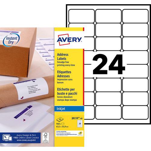 Étiquette standard, Nb d'étiquettes/planche: 24, Nb d'étiquettes: 960, Étiquette longueur: 63.5 mm Étiquette standard, Nb d'étiquettes/planche: 24, Nb d'étiquettes: 960, Étiquette longueur: 63.5 mm