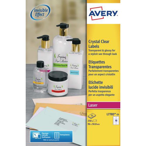 | Intitulé du produit | Étiquette transparente brillante, Nb d'étiquettes/planche: 10, Nb d'étiquettes: 250 |