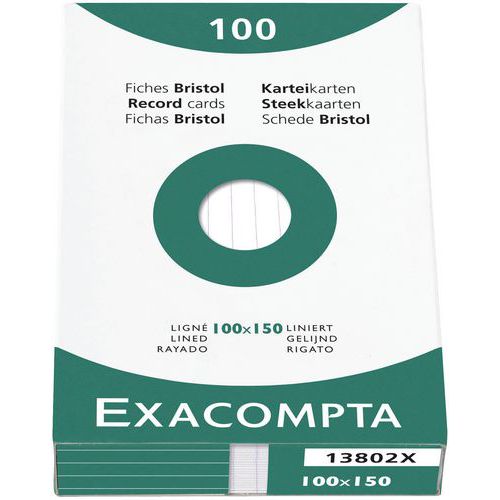 | Intitulé du produit | Étui de 100 fiches, Grammage: 205 g/m², Nb de feuilles/ramette: 100, Réglure: Lignes, Longueur: 150 mm |