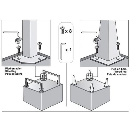 Fabriqué en France. Revêtement classé non feu M1. Assise avec coussin déhoussable. Houssage amovible maintenus par scratchs et fermeture éclair. Piètement tube acier 30 x 30 mm sur patins feutres. Hauteur 24,9 cm. Hauteur accoudoirs 33 cm. Revêtu époxy coloris aluminium Pieds à monter.