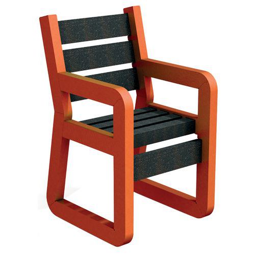 Fauteuil Chardonnay maternelle en Ipra, matière produite à partir de plastiques multi composants. Résistance au gel, à la mousse, aux UV, lisse sans risque d'écharde, traitement anti tags, nettoyage à l'eau. Structure aluminium laqué : métal léger qui a une grande résistance à la corrosion. Sans entretien, sans traitement, imputrescible. Durée de vie accrue par rapport aux modèles en bois et en plastiques. Garantie : 25 ans sur l'Ipra, 10 ans sur l'alu Fabrication à partir de matières recyclées : canettes, pots de fleurs, aluminium... Classement au feu M4. Kit de fixation fourni
