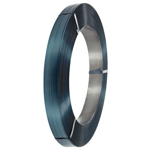 Feuillard acier : tension ultra fiable sur la durée. Matériau d'une extrême résistance à la rupture. Feuillard trancanné, non graisseux, anticorrosion. Bords arrondis pour une pose manuelle sécurisée.