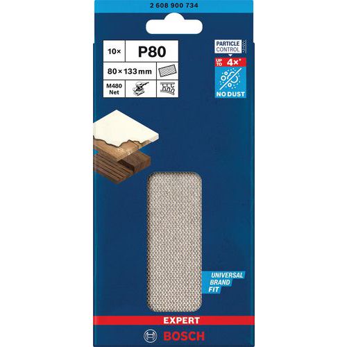 Feuilles abrasives rectangulaire M480 Expert - Bosch Extraction de la poussière jusqu'à 4 fois supérieure à celle des feuilles abrasives standard Évacuation de la poussière particulièrement efficace avec Bosch Particle Control. Se met simplement en place par fixation auto-agrippante. Idéal pour un ponçage sans poussière très efficace des surfaces planes, pour des travaux de dégrossissage et préparation des surfaces à peindre, et pour des travaux de préparation ou de finition des cloisons sèches. Idéal pour les rénovateurs : propre et efficace.