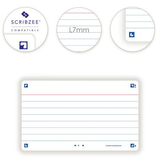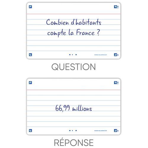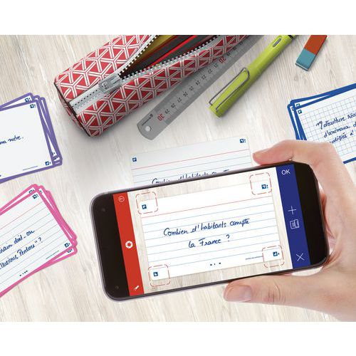 Fiches bristol Flash 2.0 75x125 mm lignées, permet de réviser en notant sur vos flashcards FLASH 2.0 une question au recto et sa réponse au verso. Méthode question/réponse, pour mémoriser un maximum d'informations par cœur. Testez-vous régulièrement pour réactiver votre mémoire et assimiler ainsi vos connaissances sur le long terme. Scribzee® est une application gratuite pour scanner, sauvegarder et classer vos cartes Flash 2.0 . Une couleur de cadre, par matière pour vous permettre de classer et de mieux repérer vos fiches par thème ou matière.