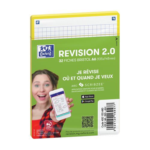 Fiches bristol Revision 2.0 Oxford A6 Q5x5 cadre compatibles avec l'application Scribzee. Scribzee® est une application gratuite pour scanner, sauvegarder et classer vos fiches dans votre smartphone. Une couleur de cadre,par matière pour vous permettre de classer et de mieux repérer vos fiches par thème ou matière. Idéal pour organiser vos fiches dans votre smartphone sans perdre de temps. Coins arrondis pour que les fiches ne se cornent pas.