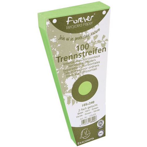 Paquet 100 fiches intercalaires trapézoïdales unies perforées Forever - 105x240mm. Les fiches intercalaires permettent d'organiser un classeur ou un classeur à levier en créant autant de séparations que nécessaire. Possibilité de créer un code couleur en utilisant des fiches de couleurs différentes.