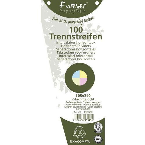 Paquet 100 fiches intercalaires trapézoïdales unies perforées Forever - 105x240mm. Les fiches intercalaires permettent d'organiser un classeur ou un classeur à levier en créant autant de séparations que nécessaire. Possibilité de créer un code couleur en utilisant des fiches de couleurs différentes.