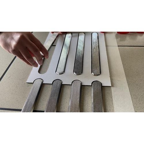 Gabarit en carton pré-découpé utilisé pour guider le perçage et le positionnement dans l'installation des bandes d'aide à l'orientation inox à sceller.