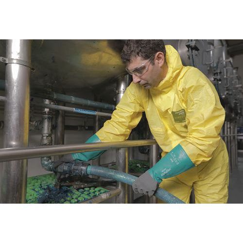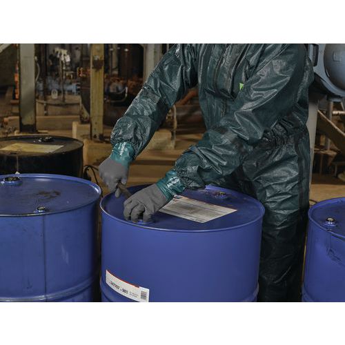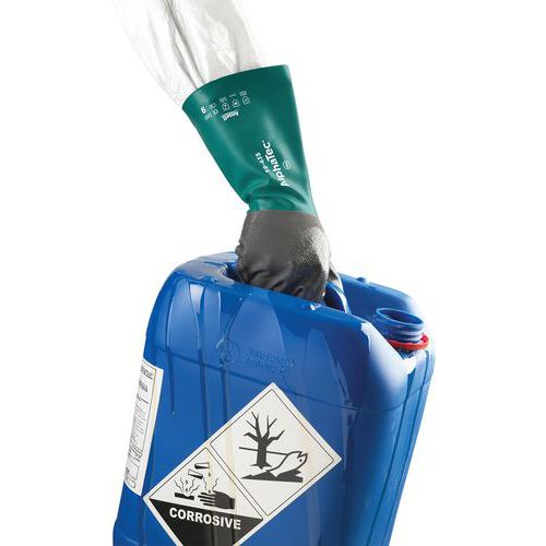 Version plus longue de l'AlphaTec® 58-430, les gants de protection des mains AlphaTec® 58-435 sont dotés de la même manchette rabattable, pour éviter les gouttes sur l'avant-bras, ainsi que d'une manchette extra-longue, pour une protection accrue de l'avant-bras et du poignet.