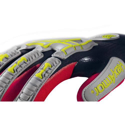 Gant de sauvetage Helix 3007 offrant une protection contre les coupures (niveau D) et les impacts, support jauge 13 HPPE/fibres d'acier, exosquelette Impact Exoskeleton™ souple et ergonomique, enduction paume nitrile sablé pour une adhérence en milieux secs comme humides, coloris haute visibilité, compatible avec les écrans tactiles.