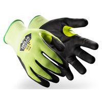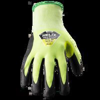 Gant de protection Helix 3062 contre les coupures (niveau F), support jauge 18 HPPE/fibres d'acier, enduction paume en mousse nitrile offrant une adhérence en milieux secs comme humides, coloris haute visibilité, compatible avec les écrans tactiles.