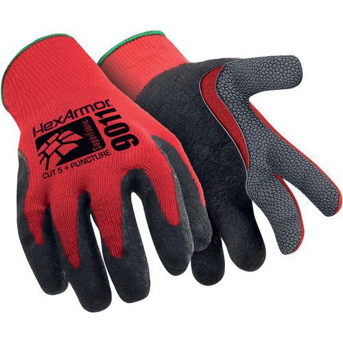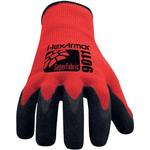 Gant de protection HexArmor 9000 Séries 9011 haute performance contre les coupures (niveau F selon EN 388) et la perforation industrielle avec support HPPE / fibre de verre, double superposition de matériaux SuperFabric® et enduction paume latex crêpé offrant de bonnes capacité de préhension en milieux secs et humides.