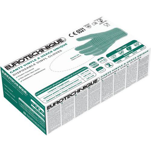 | Intitulé du produit | Gants EURO-ONE 5710 vinyle poudré AQL 1.5, Matière: Vinyle, Usage alimentaire: non, Coloris: Transparent |