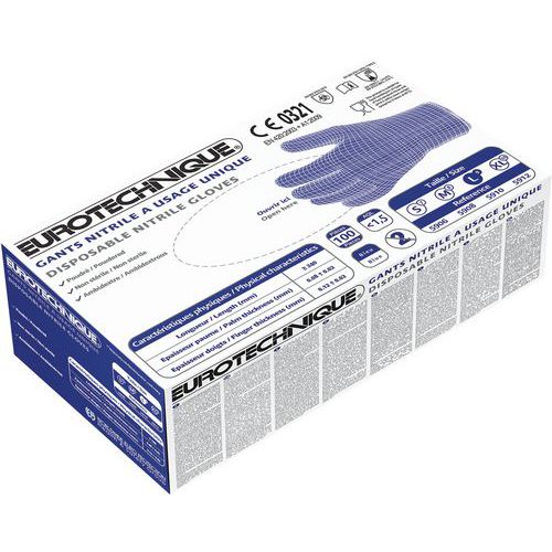 | Intitulé du produit | Gants EURO-ONE 5910 Nitrile poudré AQL 1.5, Matière: Nitrile, Usage alimentaire: non, Coloris: Bleu |