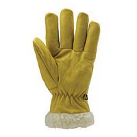 Cuir de vachette pleine fleur jaune. Fourrure synthétique en polyamide. Elastique de serrage sur la paume. Manchette de sécurité, longueur totale 32cm Norme EN 420