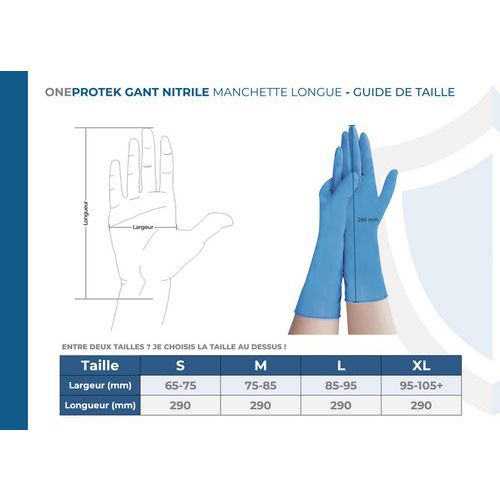 - La longueur de 290mm du gant nitrile OneProtek assure une protection renforcée des avant-bras, particulièrement utile contre les projections liquides.