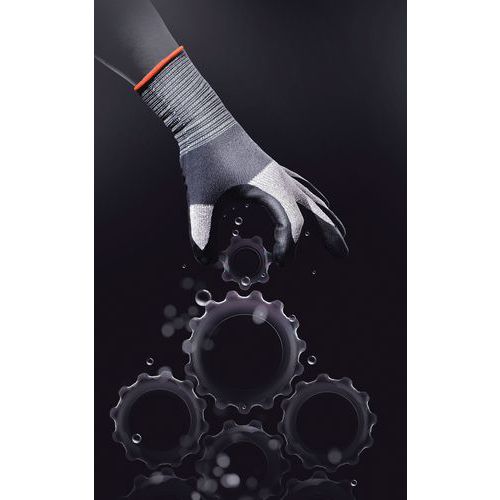 - Finition alvéolaire de la paume en nitrile permettant d’évacuer l’huile pour une préhension optimale et durable en milieu légèrement huileux