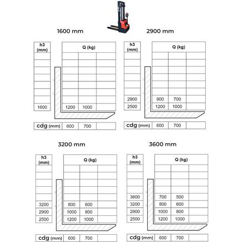 | Intitulé du produit | Gerbeur électrique 1,2 tonne, Force: 1200 kg, Hauteur de levée maxi: 2600 mm, Fourche longueur: 180 mm |