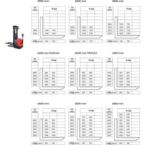 - Ce gerbeur électrique est équipé d'un mât DUPLEX pour une capacité de charge de 1,6 tonne avec un hauteur d'élévation standard de 2830 à 5430 mm.