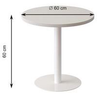 Plateau mélaminé épaisseur 25 mm avec chant ABS 2 mm Plateau diamètre 60 cm Pied acier laqué époxy blanc antirayure. Piètement central sur socle acier laqué époxy blanc anti-rayure. Socle Ø 49,5 cm, épaisseur 4 mm. Livré prêt à monter avec notice.