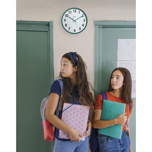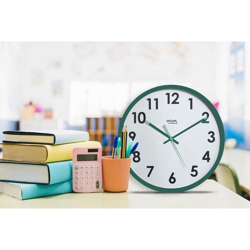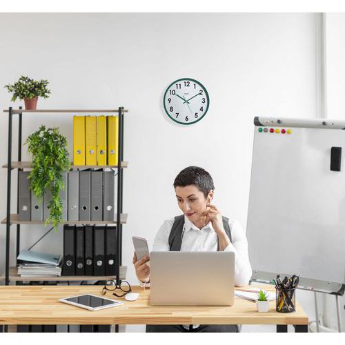 Horloge Eco-conçue Naturalis vert. Mouvement silencieux pour assurer calme et concentration dans vos espaces de travail. Design élégant , elle s'intègre harmonieusement dans n'importe quel espace. Ajoute une touche contemporaine tout en respectant le bien-être de votre environnement.