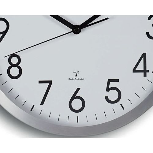 Un modèle élégant et très robuste. Cadre large en aluminium brossé. Synchronisation automatique par le signal DCF77, passage automatique de l´heure d´été à l´heure d´hiver.. Des interférences, dues à des situations géologiques ou des constructions métalliques dans les bâtiments, sont possibles. Dans ce cas un réglage manuel sera nécessaire. Chiffres arabes noirs en police fine ayant du style. Hauteur des chiffres : 4,4 cm. Couvercle en verre minéral plat. Extrêmement bien lisible. Pour le bureau moderne, les locaux représentatifs et l'utilisateur aimant le design. Cadran blanc avec division des heures et des minutes. Axe de couleur de l'aiguille. Mouvement silencieux. Fixation murale par œillet en forme de poire.