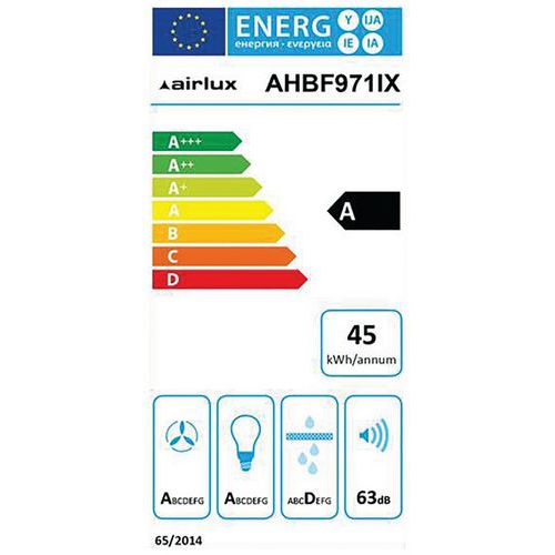 | Intitulé du produit | Hotte décorative murale AHBF971BK, Débit d'air: 679 m³/h, Coloris: Noir, Type de produit: Plat |