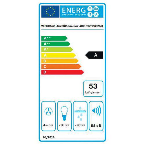 | Intitulé du produit | Hotte décorative murale VERSO1421, Débit d'air: 708 m³/h, Coloris: Noir, Type de produit: Inclinée |