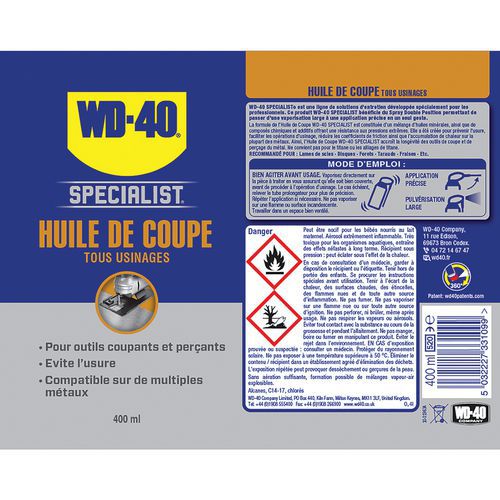 | Intitulé du produit | Huile de coupe Specialist, Aérosol brut/net: 520/400, Contenance: 400 mL |