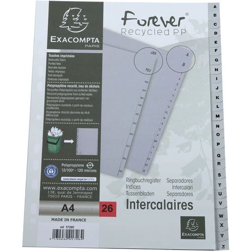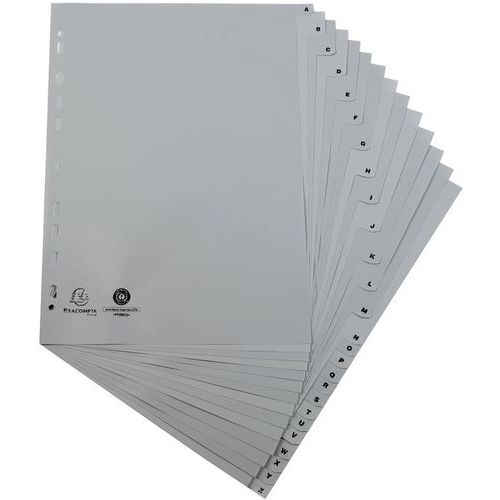 | Intitulé du produit | Intercalaire imprimé alphabétique, Nb de divisions: 20, Coloris: Gris, Pour format: 210 x 297 mm (A4) |