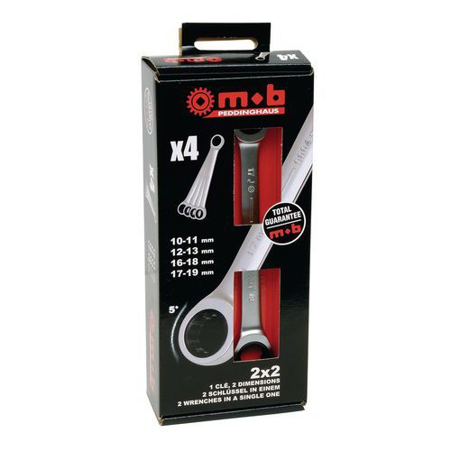 | Intitulé du produit | Jeu de 4 clés à cliquet 2x2 en coffret, Capacité (Dimensions): 10x11-12x13-16x18-17x19, Nb de pièces: 4 |