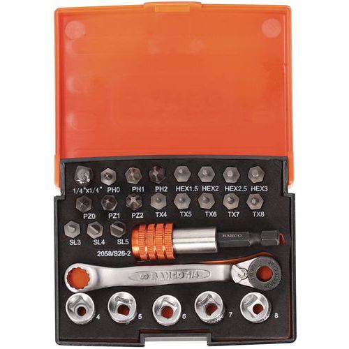 | Intitulé du produit | Jeu embouts et douilles 1/4 vis fente/PH/PZ/TORX/6 pans - Bahco, Nb de pièces: 26 |