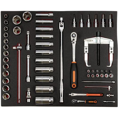 | Intitulé du produit | Jeu extracteur/cliquet à tête ronde/douilles module mousse 3/3 - Bahco, Nb de pièces: 58 |