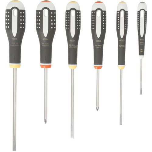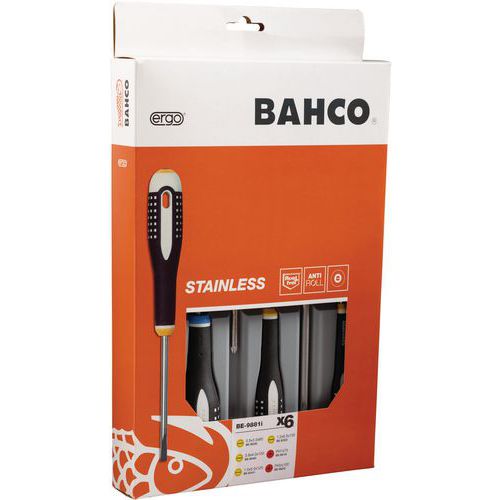 | Intitulé du produit | Jeu tournevis ERGO acier inoxydable vis fente/Phillips - Bahco, Nb de pièces: 6, Empreinte vis: Philips |