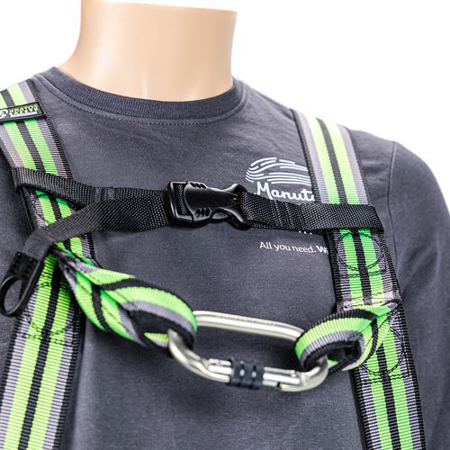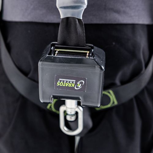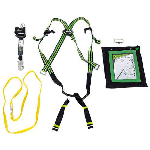 Kit spécialement conçu pour la maintenance industrielle avec harnais, mousqueton, anneau d'ancrage et antichute à rappel automatique en sangle.
