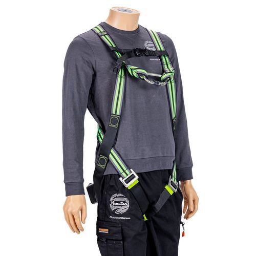 Kit composé de 1 harnais, 1 mousqueton acier verrouillage à vis, 1 anneau d'ancrage longueur 1,20 m, 1 antichute à rappel automatique en sangle longueur 2,5 m, 1 sac de transport.