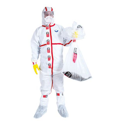 Kit contenant : 1 combinaison de types 5 et 6, E.P.I. équipement de protection individuelle, catégorie III en non tissé 1 paire de gant, jaune, classifiée E.P.I. 1 demi-masque pliable filtrant, conforme à la norme EN149 : 2001, classe FFP3 1 paire de lunette-masque, norme EN166 1 paire de sur-botte WeePro 1 sac à déchet avec logo amiante 90 x 110 cm – 65 microns 1 rouleau adhésif, 48 mm x 33 mètres pour fermeture du sac à déchets et fixer les jonctions entre les accessoires et la combinaison 1 sac avec zip pour ensachage des éléments du kit considérés comme déchets après utilisation.
