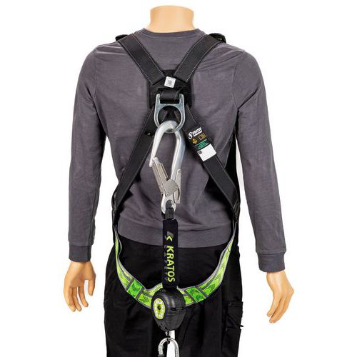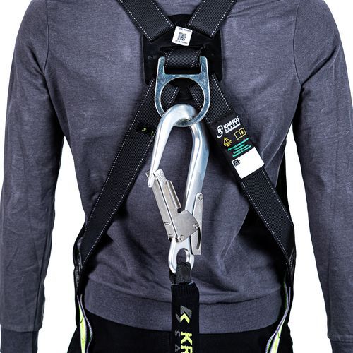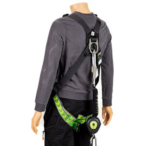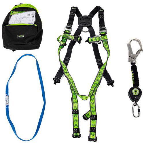 Kit composé de : 1 harnais spécifique échafaudage, 1 antichute à rappel automatique sangle 2 m, 1 anneau d'ancrage en sangle 20 mm, longueur 0,80 m, 1 sac à dos avec poche extérieur à zip, capacité 12L.
