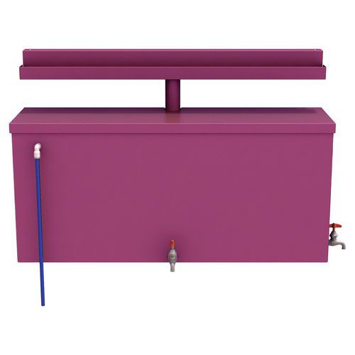 1 robinet pour le potager, 1 robinet pour le poulailler, 1 trop plein. Système de filtration par mousse et grille (nécessite un nettoyage 1 à 2 fois par an). Complètement fermé pour éviter le développement des moustiques. Livré démonté