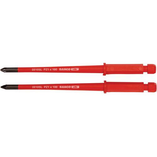 | Intitulé du produit | Lame interchangeable isolée Pozidriv diamètre réduit, Lame longueur: 100 mm, Capacité (Dimensions): PZ2 |