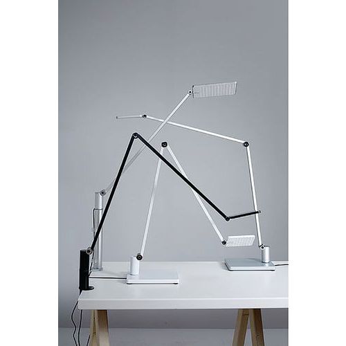Lampe de bureau à LED au design très fin avec un élégant bras articulé en aluminium à 2 éléments et passage des câbles invisible. Socle en pince. Longueur du câble d'environ 2 m. Teinte de la lumière : blanc chaud (température de couleur 3 000 K) Fabriqué en Allemagne Service installation/montage : Option montage